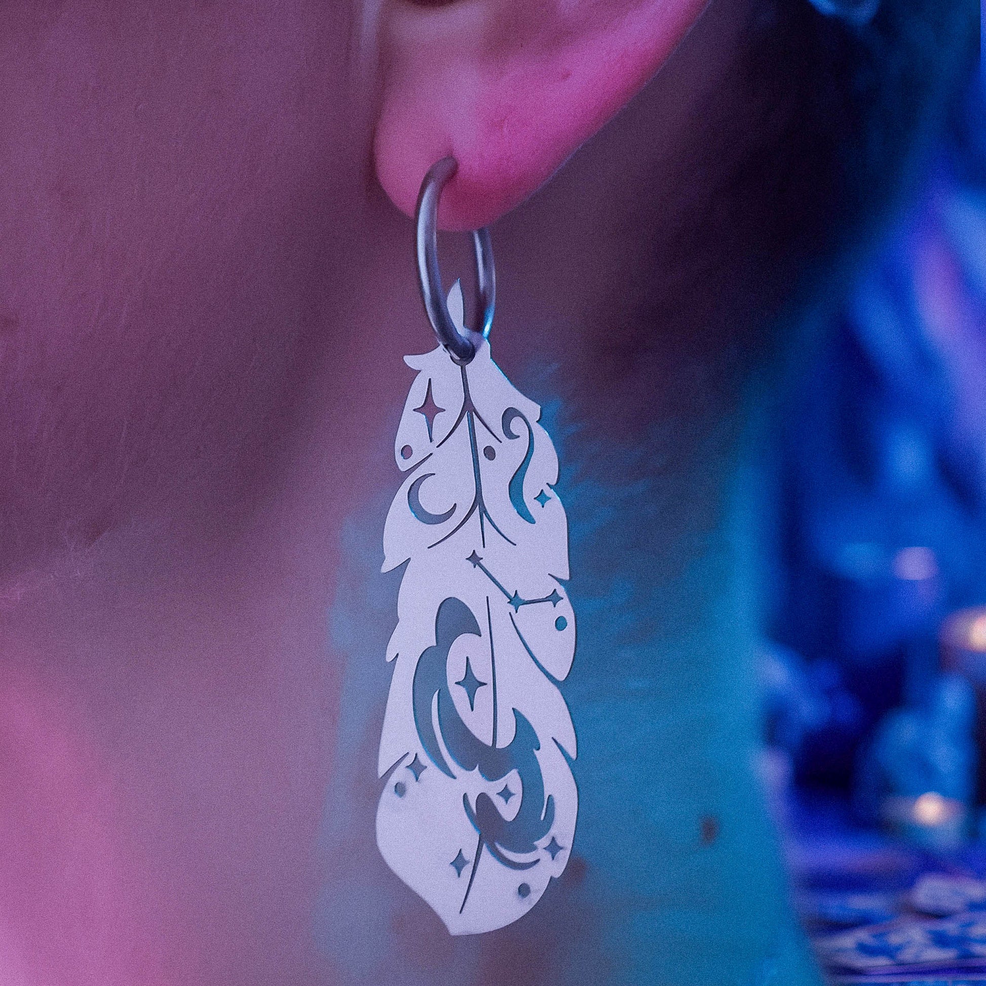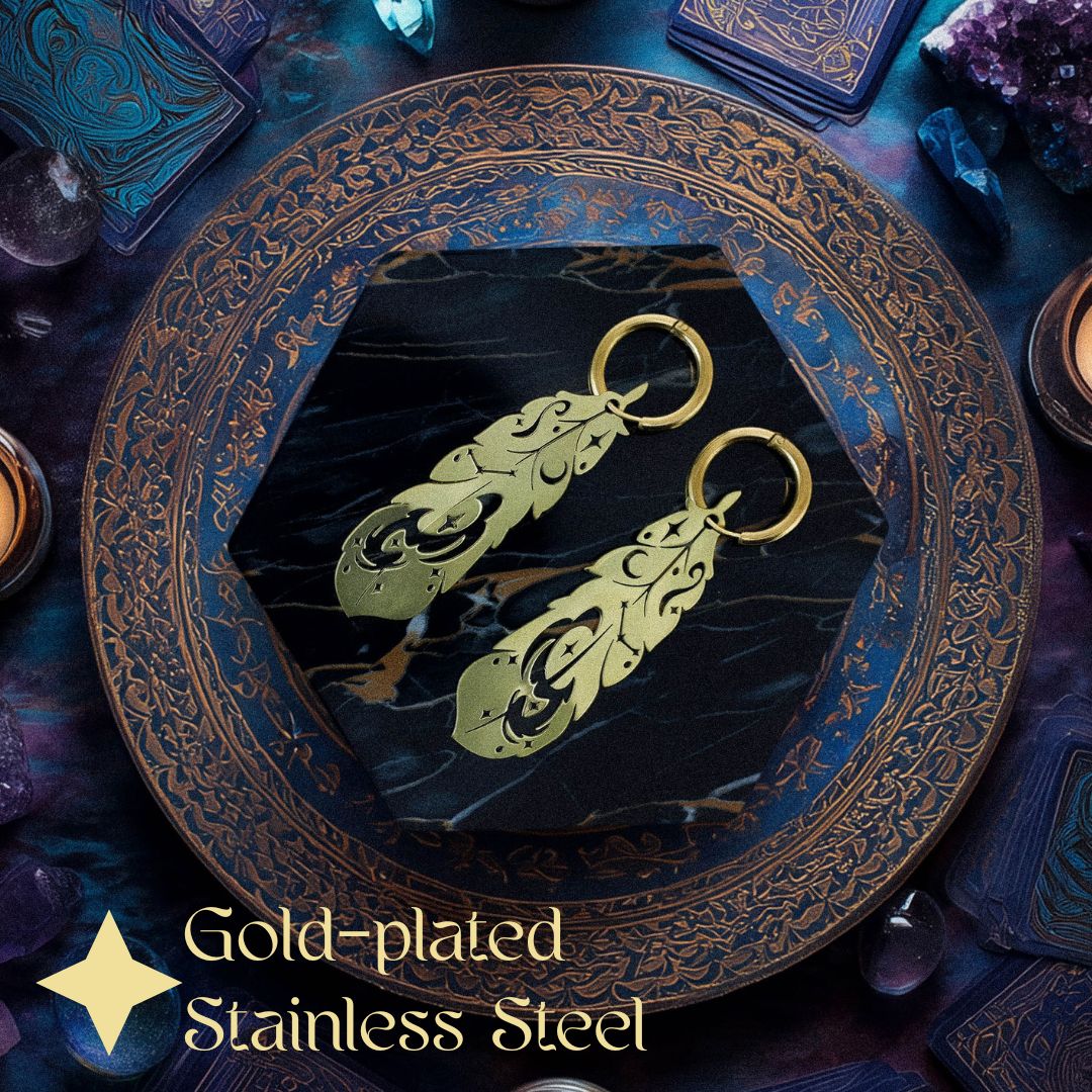 Our metal feather earrings are made with care and precision from laser-cut gold-plated stainless steel or laser-cut 304 stainless steel. They are balanced on hypoallergenic thick gold-plated surgical stainless steel hoops - great for sensitive ears.